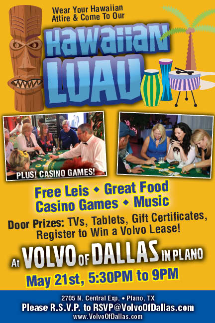 This month, we’ll be giving away several terrific door prizes. You could even win a lease on a brand-new Volvo! If you would like more information about our Hawaiian Luau Casino Night at Volvo of Dallas, stop by our showroom or fill out our contact form. If you are planning to attend this month, please RSVP at RSVP@VolvoOfDallas.com.